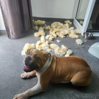 Comme nous avions déjà 2 "vieux chiens" de 11 et 13 ans, Leeloo et Iwok, nous pensions "naïvement" que ce bouledogue anglais pouvait être éduqué comme eux. Quelle erreur ! Ce n'est pas du tout un bichon....